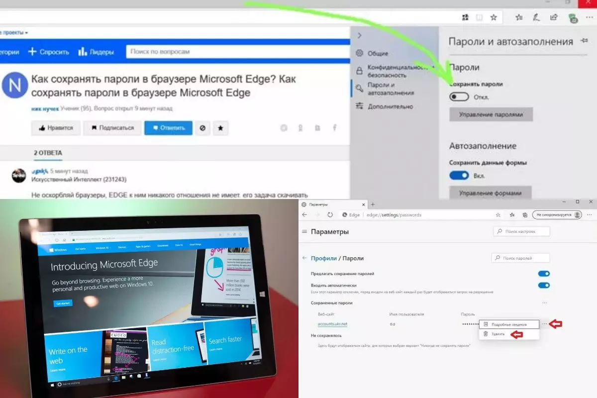 Аналогично Safari, браузер Edge рассчитан исключительно на пользователей Android и OS Windows. В компьютере, открыть браузер и перейти в его настройки. В дополнительных параметрах, будет пункт «Конфиденциальность и службы», в нем перейти в «Управления паролями».